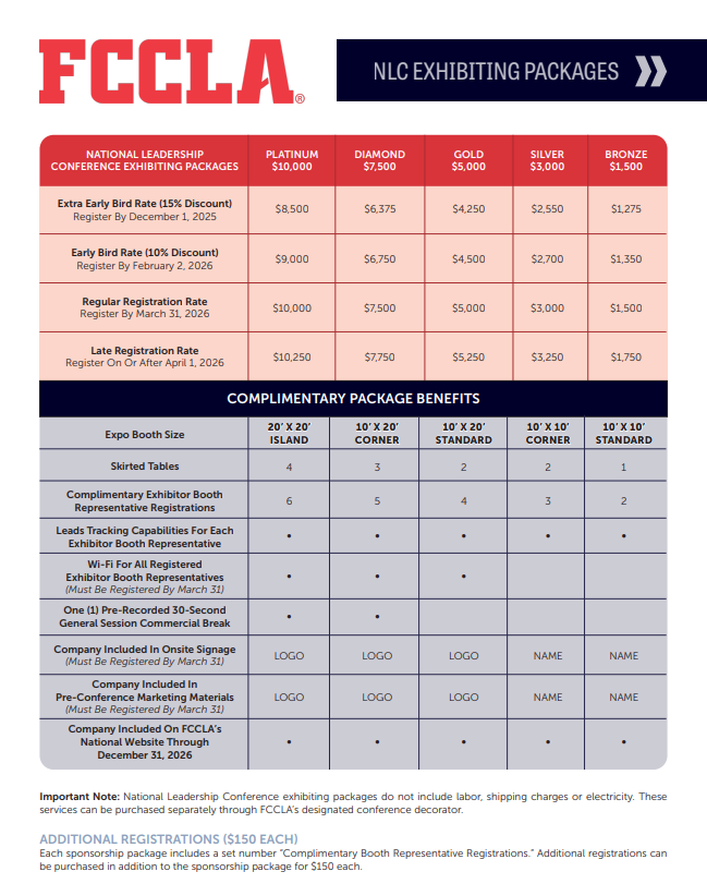 Join FCCLA in Washington, D.C., for the 2026 National Leadership Conference (NLC) as we get ConneCTEd in the nation’s capital! This premier event will unite thousands of members, advisers, guests, and partners for an unforgettable week of leadership, innovation, and opportunity. As an exhibitor, you will showcase your organization to an audience eager for new resources and partnerships. Picture your booth alive with energy as students explore career possibilities, advisers search for tools to strengthen their classrooms, and decision-makers engage with what you have to offer. Your brand becomes part of the experience that attendees carry home and integrate into their schools and chapters. NLC helps students, advisers, and industry partners get ConneCTEd to each other, to new opportunities, and to the future of Family and Consumer Sciences education. Exhibiting at NLC means more than visibility. It means creating meaningful relationships that spark innovation, empower leadership, and drive lasting impact. Secure your place today and be part of what it means to be truly ConneCTEd!