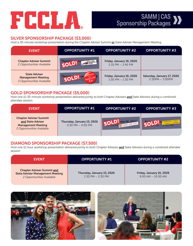 Each year, FCCLA hosts two (2) professional development conferences in the location where the National Leadership Conference will take place that summer. These conferences provide an exceptional opportunity for sponsors to engage with FCCLA Advisers and State Leaders who are dedicated to enhancing their skills and knowledge. These events offer exclusive sponsorship opportunities to engage directly with the decision-makers shaping FCCLA’s future.